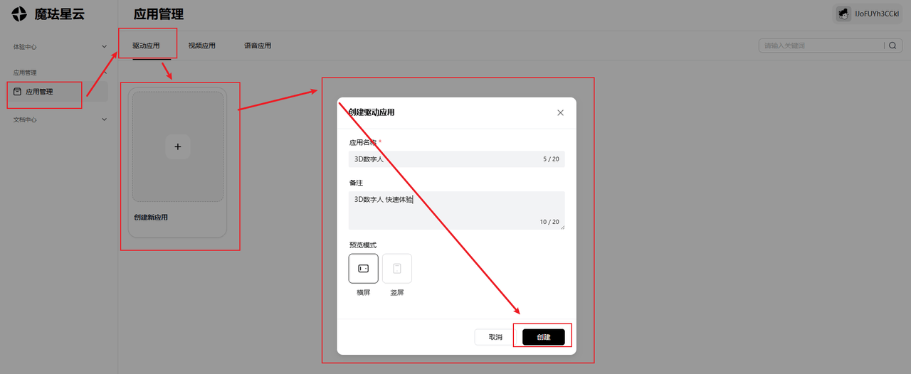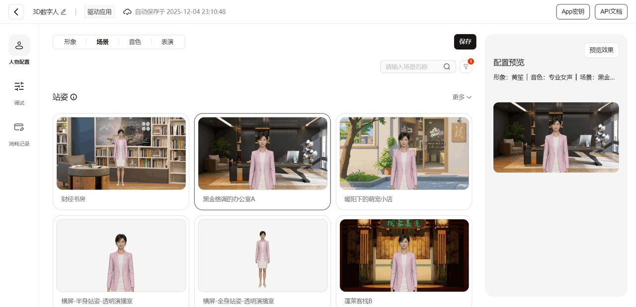 配置应用的数据人基本信息,形象、场景、音色、表演等配置完成后保存数字人