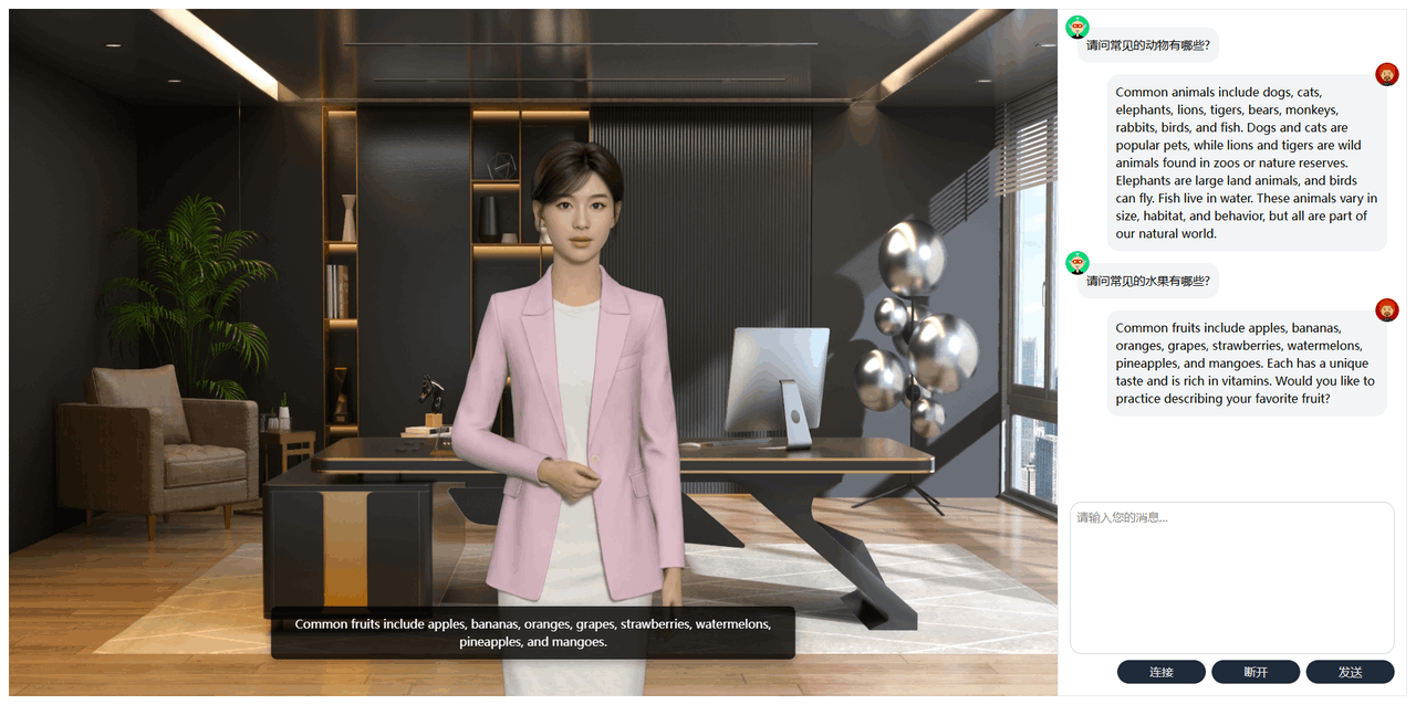 基础对话:在输入框写英语句子(比如“I want to learn English”),点“发送按钮”,数字人会开始进行语音播报并回应你;