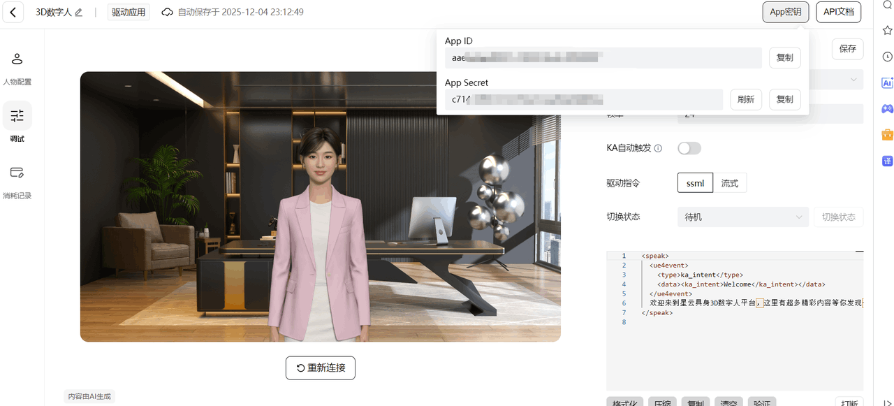 点击「连接」按钮初始化,等待加载完成即可看到 3D 数字人