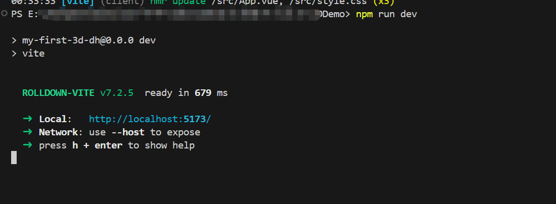 Z:\>npm create vite@latest my-first-3d-DH -- -t vue-ts --rolldown --no-interactive > npx > create-vite my-first-3d-DH -t vue-ts --rolldown --no-interactive | o Scaffolding project in Z:\my-first-3d-DH... | — Done. Now run: cd my-first-3d-DH npm install npm run dev -
