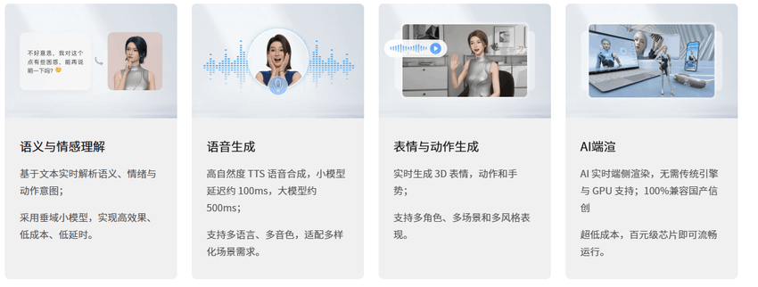 魔珐星云的核心竞争力在于,依托文生3D多模态动作大模型与AI端渲解算技术,从底层打破了3D数字人生成“高质量、低成本、低延时”的不可能三角,从而真正支持AI具身智能大规模应用。文生3D大模型可直接将文本/语音指令转化为自然连贯的3D动作与表情,省去人工建模与动捕环节;AI端渲解算则通过WebGL将渲染任务转移至客户端,无需依赖GPU服务器,在保证视觉效果的同时降低硬件成本与网络延时,最终为AI具身智能的大规模应用扫清技术障碍。这一突破也集中体现在其六大核心能力上: