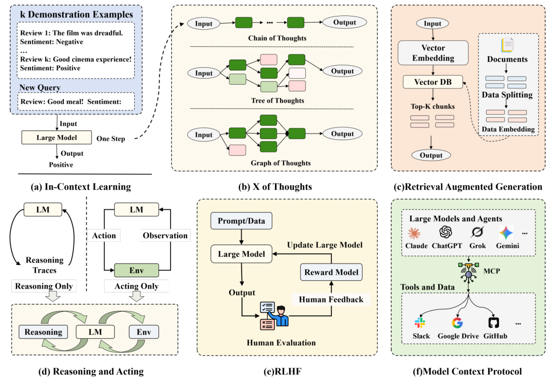**上下文学习(ICL[30])**使大模型能够通过精心设计的提示实现零样本泛化,让它们能够在不需要额外训练和调整的情况下应对新任务。利用输入提示中的上下文,大模型能够理解任务要求并生成相关输出,使其成为从自然语言处理到特定任务问题解决的多功能工具。最近的进展集中在优化提示技术,如自动化提示生成和动态示例选择,以提高跨领域ICL的鲁棒性。
