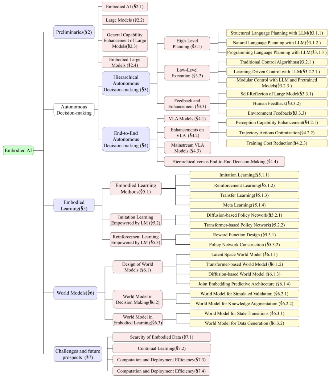 本文撰写思路,首先介绍具身智能的基本概念和大模型的分类:大语言模型、视觉语言模型、多模态大模型等,并探讨大模型在通用能力增强方面的技术,如上下文学习、思维链、检索增强生成等。随后,从分层决策范式、端到端决策范式、具身学习三个方面展开详细分析。