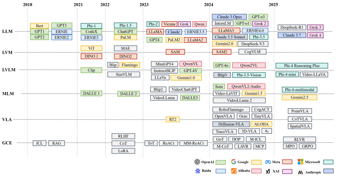 大模型,包括大语言模型(LLM)、视觉大模型(LVM)、视觉-语言大模型(LVLM)、多模态大模型(MLM)和视觉-语言-动作(VLA)模型,在架构、数据规模和任务复杂性方面取得了显著突破,展示了强大的感知、推理和交互能力,如图3所示主要LLM时间线。