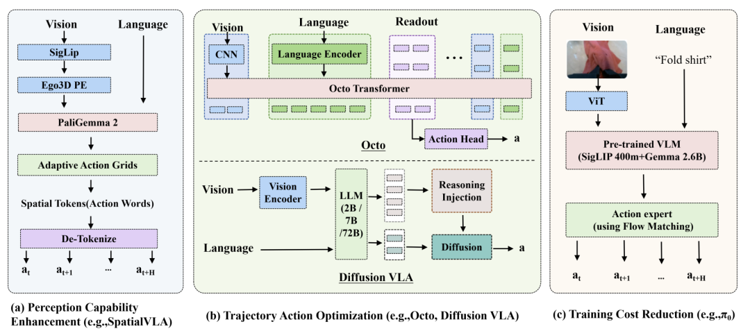 **为了克服这些限制,出现了基于连续动作生成的VLA模型和开源VLA模型。**最近关于VLA模型的研究进一步解决了这些挑战。BYO-VLA[23]、3D-VLA[24]、PointVLA[25]处理视觉输入。Octo[26]和Diffusion-VLA[27] 提高了动作生成的准确性。TinyVLA[28] 和 π0[29] 提升了计算效率。