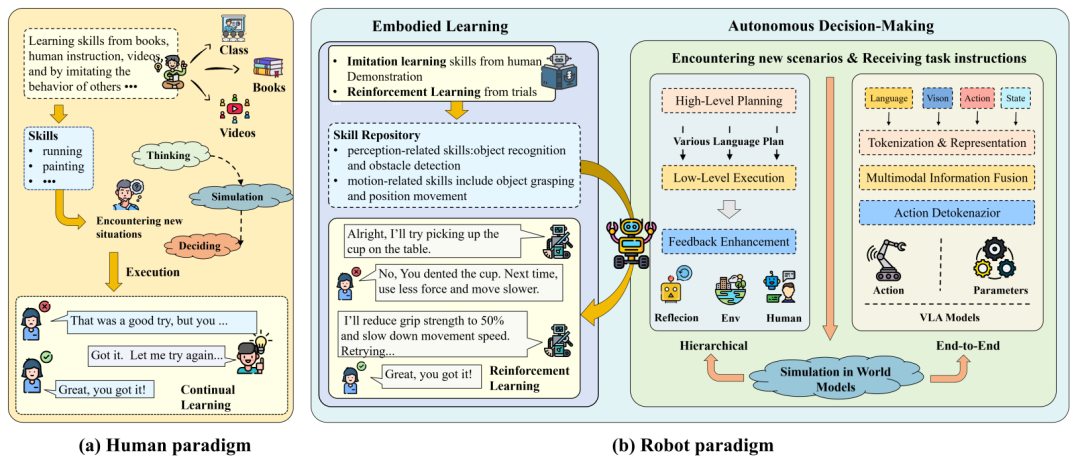 这一简化流程使智能体能够解释复杂指令,感知动态环境,并执行精确的物理动作,从而产生更健壮、更多功能性的具身人工智能系统。除了增强规划智能外,还越来越多地探索其生成能力,以推进具身学习并协助构建世界模型,进一步支持通向AGI的道路。