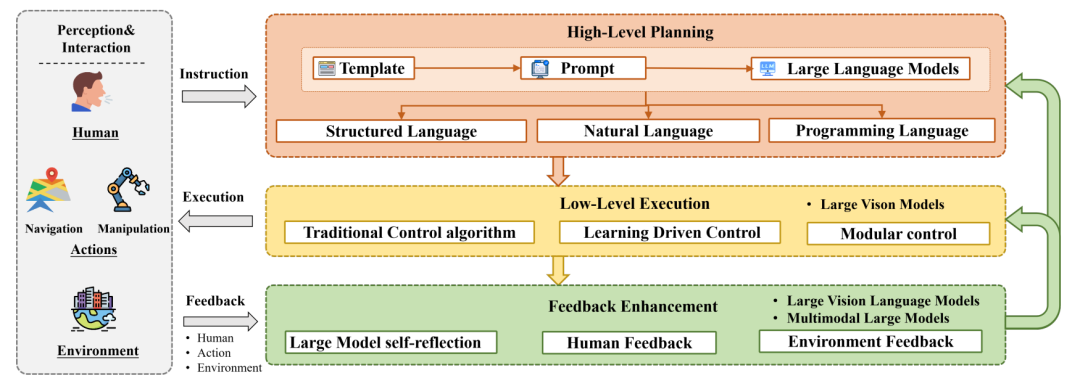 大模型在鲁棒学习、推理和泛化能力方面的进步,在复杂任务处理中展现了希望。通过整合大型模型的推理能力与物理实体的执行能力,它为自主决策提供了新的范式。如图5所示,环境感知首先解释智能体周围的环境,LLM赋能的高层规划随后考虑感知信息和任务指令将复杂任务分解为子任务,LLM赋能的低层执行随后将子任务转化为精确的物理动作,最后LLM赋能的反馈增强引入闭环反馈以提高智能水平。
