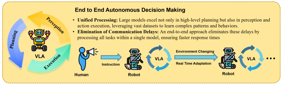 VLA 模型近期获得了巨大关注,核心目标是通过直接将多模态输入映射到动作输出,而不是通过层次决策的中间步骤,从而提高机器人的感知-动作整合能力。