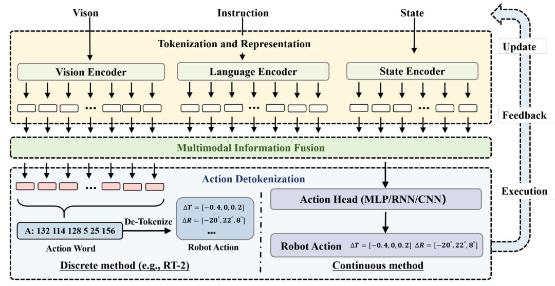 VLA(视觉-语言-动作)的概念最初由 RT-2 提出,该方法利用预训练的视觉-语言模型将动作空间离散化为动作标记,并通过联合微调互联网数据和机器人数据实现泛化。