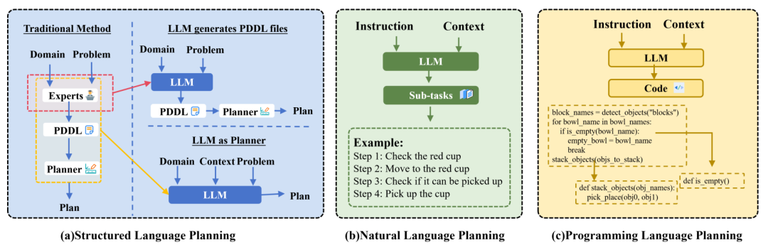 高层规划的目标是根据任务指令和感知信息制定合理的计划。传统方法依赖于基于规则的规划,但在非结构化或动态环境中适应性较差。大模型通过其零样本和少样本泛化能力,显著提升了高层规划的灵活性和适应性。具体方法包括: