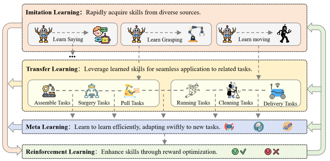 **具身学习旨在使智能体在与环境互动的过程中获得复杂技能并提升其能力。**通过不断学习和优化技能,智能体能够实现精确决策和实时适应。这种能力可以通过多种学习策略的协调来实现,如图12所示。