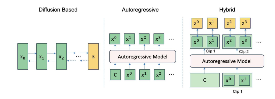 三种常见视频生成,包括基于扩散,基于自回归和混合模式。目前混合模式是主流,能够生成视频比较长,可以达到分钟级;基于扩散模式,难以用GPU并行加速,通常生成视频较短,数秒乃至数十秒,但保真度比较高;自回归模式则相反,相对容易用GPU加速,保真度略低。