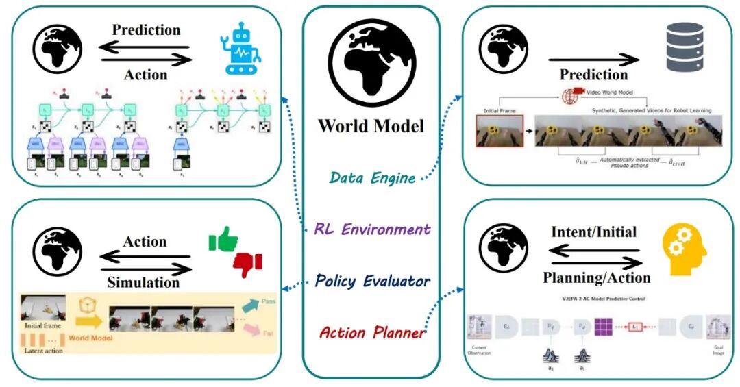 具身智能世界模型四大用途,分别是数据引擎,强化学习环境模拟优化策略,策略仿真评估,动作规划器。