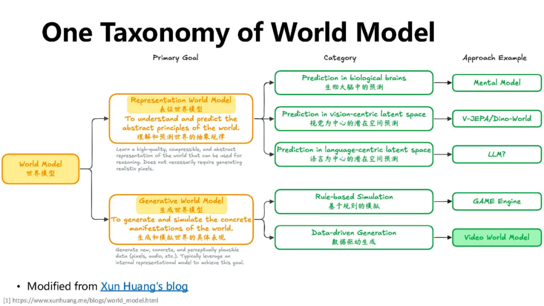 还有一种分类,按表征分,抽象表征 (Abstract representation): 就像我们大脑想象未来一样,它可能是一些概念、关系或物理量的抽象描述。想象打台球,你需要预测母球撞击目标球后,两颗球各自的运动轨迹。大脑中那个进行“预演”和“推算”的过程,就是一个内在的世界模型。又好比开车,你要让车实现某种轨迹,需要在大脑中推算方向盘转动幅度和速度控制。近似于物理世界,具象表征 (Concrete representation): 就像视频模型生成下一帧画面一样,它可能是对世界细节的像素级描绘。