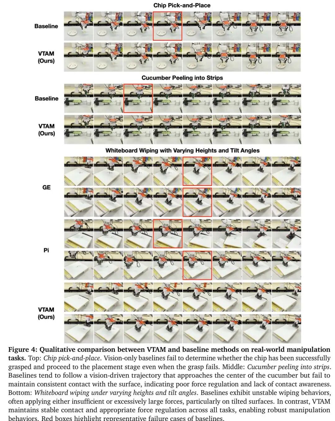 为解决动作训练中常见的失效模式——模型默认依赖视觉线索,抑制触觉信息,本文增加了从变形中推导的虚拟力预测目标,让触觉监督贯穿整个控制通路。在需要精确力调节的真实机器人任务(包括薯片抓取放置和黄瓜剥离)中,VTAM相较于纯视觉和简单触觉融合基线模型,大幅提升了任务成功率和交互稳定性,这表明直接对接触动力学进行建模,对于实现可靠的物理交互至关重要。