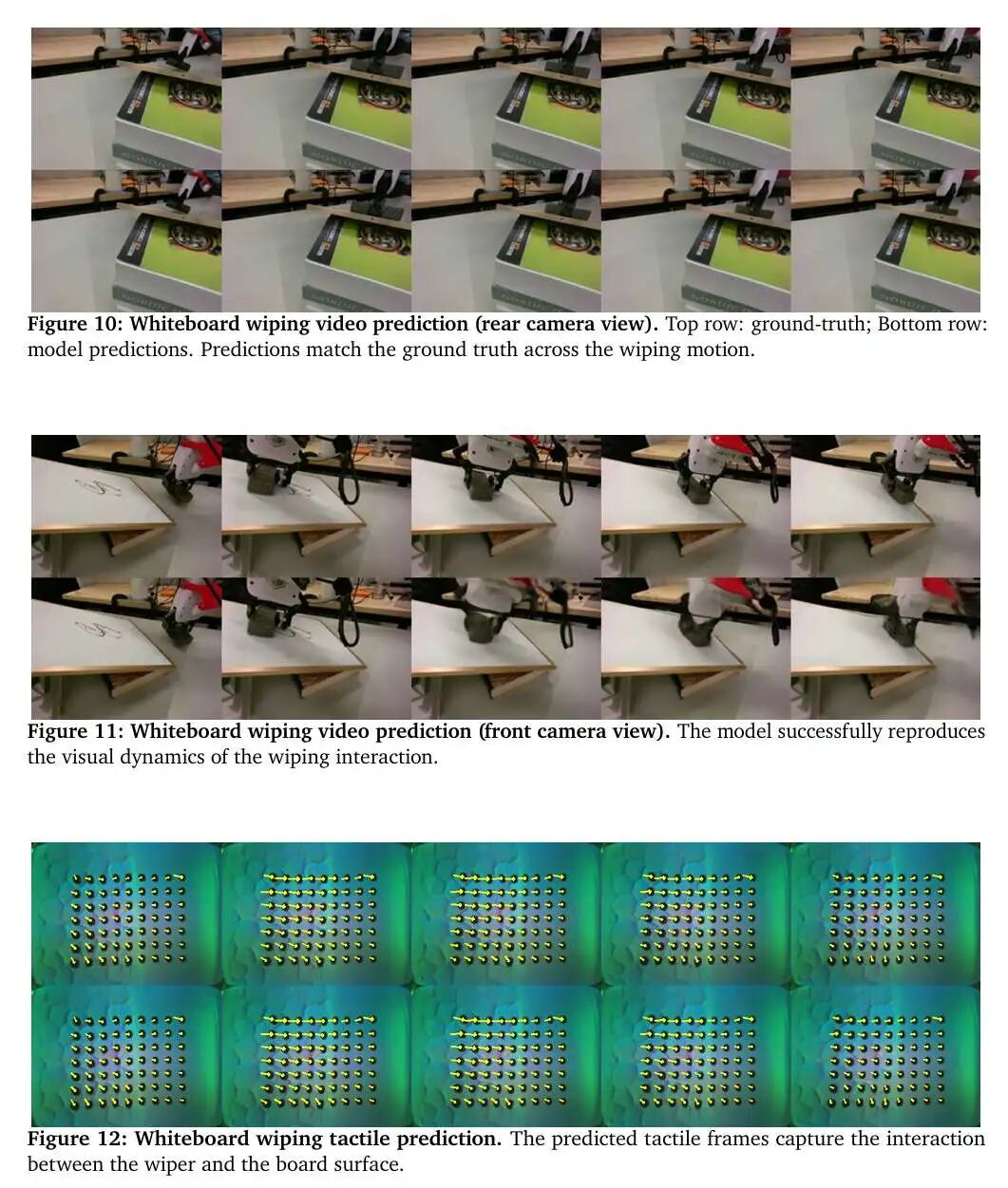 本文对两项富接触操作任务(黄瓜剥离和白板擦拭)的视频预测结果进行定性可视化。为评估视觉保真度,对比了后置相机(图7、图10)和前置相机(图8、图11)的预测帧与真实帧;此外,通过预测触觉流(图9、图12),评估模型预测接触动力学的能力。触觉图中的黄色箭头为估计的接触力大小和方向的可视化结果,需注意的是,该箭头仅用于可视化,模型处理的是原始触觉表征,无显式的力输入。结果表明,VTAM能有效捕捉跨模态的视觉运动和细粒度接触动力学。