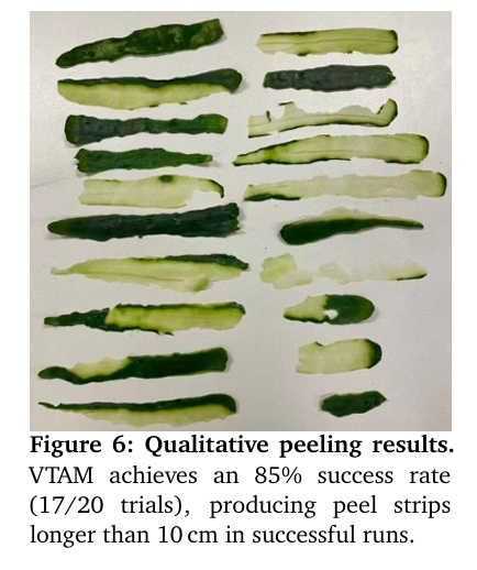 黄瓜剥离:在剥离可变形蔬菜的过程中保持稳定接触,需要持续的剪切力控制。该任务要求对工具滑动过程中摩擦力和变形的微小变化保持敏感;