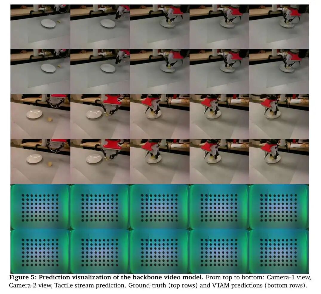 本文在图5中对骨干视频模型的预测结果进行了可视化,对于每个视角和触觉预测,上排为真实帧,下排为模型预测帧。模型保留了视角间的时间一致性和视角内的动力学特征,仅在与操作无关的细节处存在轻微模糊,表明其为动作生成提供了可靠的视觉-触觉世界建模能力。
