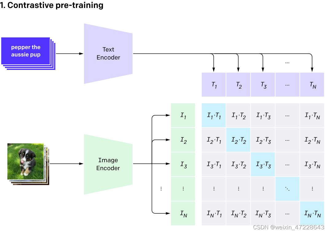 模型中使用visual_embedding 叉乘 text_embedding,得到一个[N, N]的矩阵,那么对角线上的值便是成对特征内积得到的,如果visual_embedding和对应的text_embedding越相似,那么它的值便越大。