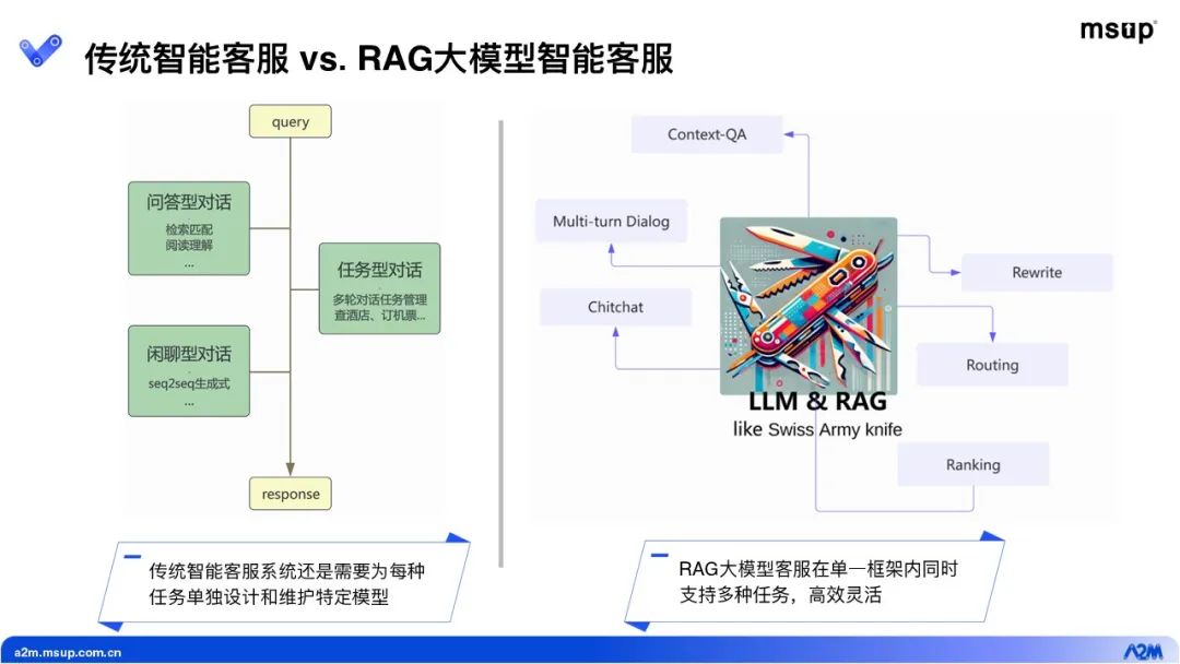 传统客服是“拼积木”,大模型客服是“用万能工具箱”来解决问题。 RAG 的引入,解决了知识时效性问题,使得大模型真正可用于业务场景。