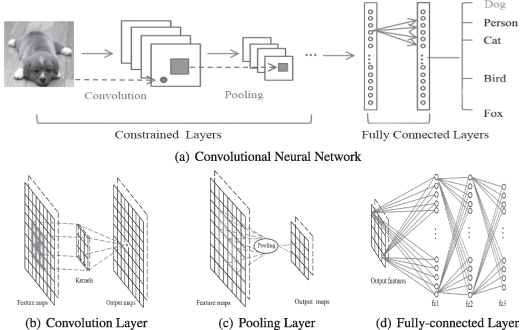 卷积神经网络是一种特殊的深度网络,它考虑了数据的局部拓扑结构(Li, Xia, Du, Lin, & Samat, 2017;Sze,Chen,Yang和Emer,2017)。卷积神经网络包括全连接网络和包含卷积层和池化层的约束网络。约束网络使用卷积和池化运算来实现局部感受野和参数约简。与 DBN 和 SAE 一样,卷积神经网络也通过随机梯度下降算法进行训练。它在医学图像识别(Maggiori,Tarabalka,Charpiat和Alliez,2017)和语义分析(胡,Lu,Li,&Chen,2014)方面取得了很大进展。具有代表性的 CNN 如图 3 所示。