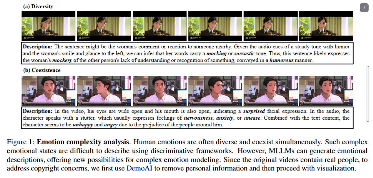传统方法主要依赖判别式模型,将人类情感映射到预定义情感分类体系中最可能的类别。目前应用最广泛的分类体系是埃克曼理论(Ekman & Keltner,1970),该理论将所有情感划分为六大基本类别:悲伤、愉悦、恐惧、愤怒、惊讶和厌恶。然而,这类分类框架在刻画人类情感状态时存在局限性。例如,由于特定文化语境下的表达方式(Matsumoto,2001)、依赖上下文的隐喻(Kövecses,2003)以及高度个性化的行为模式(Izard 等,1993),人类的情感表达呈现出多样性与细微差异性。当前的闭集分类范式难以捕捉现实场景中情感表达的丰富多样性(Plutchik,1980)。同时,僵化的情感分类体系通过将离散标签(如愤怒或惊讶)强加于通常共存的细微情感状态上,过度简化了情感体验的连续谱系(Cowen & Keltner,2017)。图 1 展示了相关示例,其中(a)图和(b)图分别体现了情感的多样性与共存性问题。