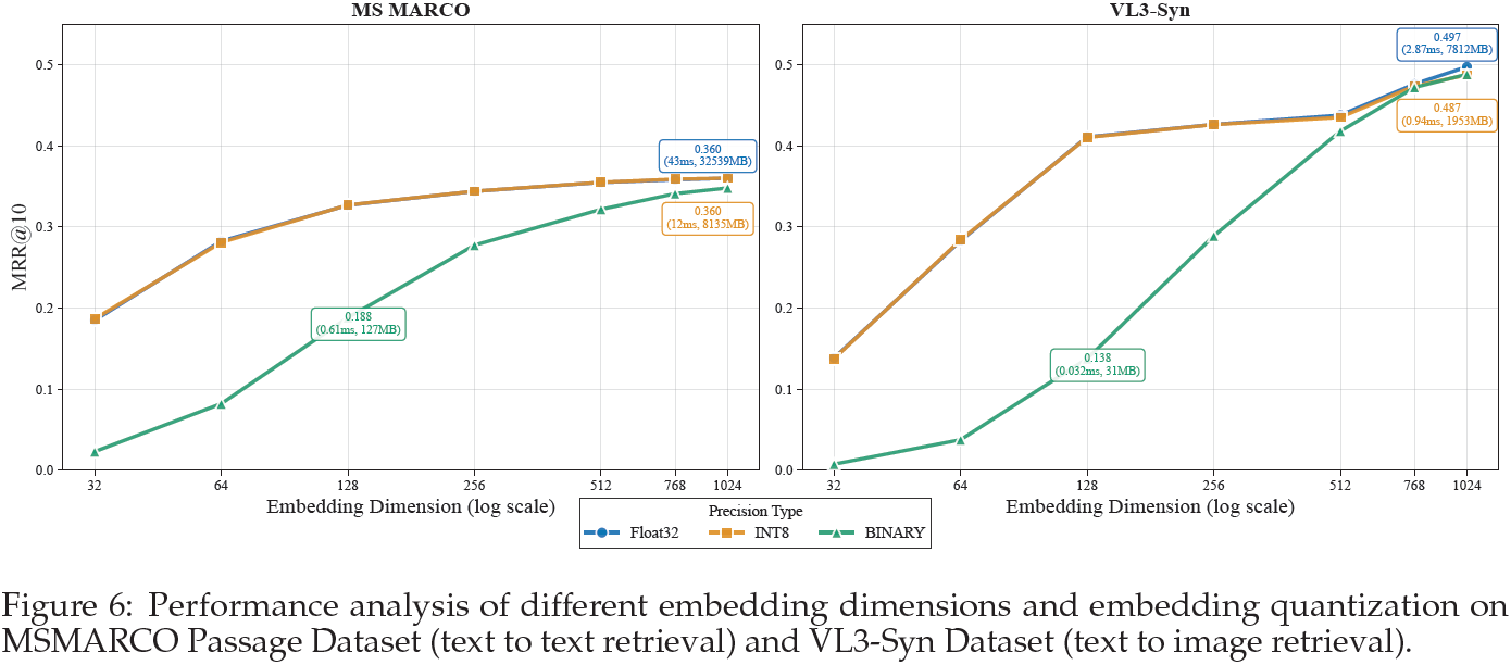 嵌套表示学习与嵌入量化的有效性:在文本检索(MSMARCO)和图文检索(VL3-Syn)任务上的实验表明: