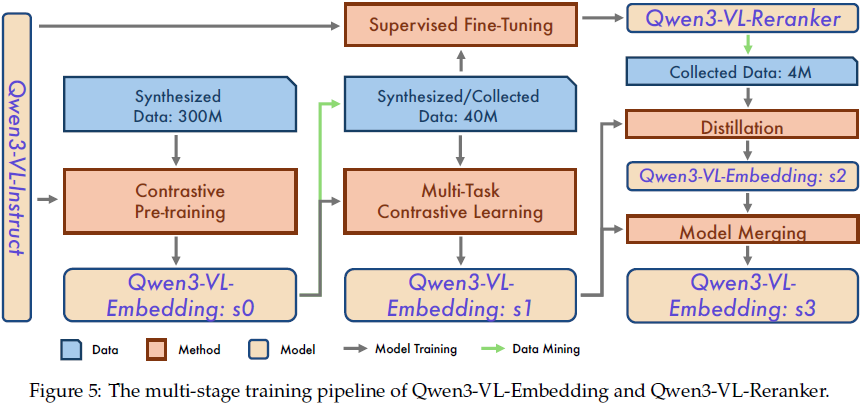 - 结合精选的公共数据集、内部数据和采样的合成数据,使用改进后的嵌入模型(s0)进行数据挖掘以保障质量,然后进行多任务对比学习,得到嵌入模型 Qwen3-VL-Embedding: s1。