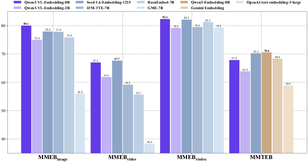 实验评估表明,Qwen3-VL-Embedding 系列在各类多模态嵌入基准测试中取得了领先成果。