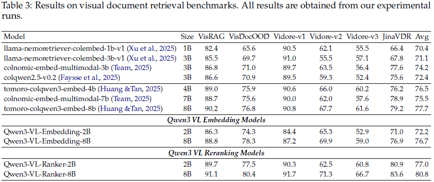 视觉文档基准测试:在 JinaVDR和ViDoRe-v3 等最新视觉文档检索基准上,本文的嵌入模型性能与计算成本高得多的 ColPali 类模型相当,而重排模型则大幅超过同等参数规模的 ColPali 模型。