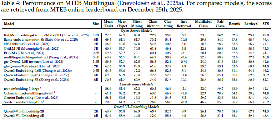 纯文本评估:在 MTEB 多语言文本嵌入基准上,Qwen3-VL-Embedding-8B 取得了 67.9 的平均任务得分,与同类纯文本嵌入模型性能相当。