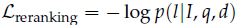 使用教师重排模型为每个查询 q 计算其与一个正样本和 K 个负样本的精细相关性分数,并转换为概率分布 P_reranker(d∣q)。
