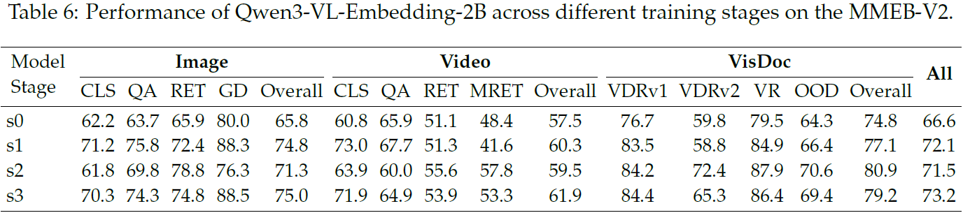 - 由于 s2 在检索任务上提升但在分类 / QA 任务上略有下降,本文将其与 s1 合并,得到最终模型 Qwen3-VL-Embedding: s3,在所有评估任务上达到最优且平衡的性能。