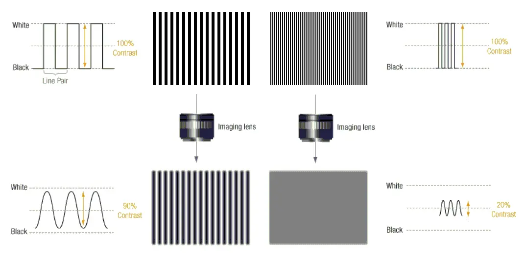 由于光能量扩散的原因,理想黑白线对(line-pair)经过镜头之后会出现边缘模糊。如果把方波信号看作是无穷多正弦信号的叠加,那么光学系统的作用就相当于一个空间低通滤波器,会过滤掉信号中的高频分量,只保留低频分量。