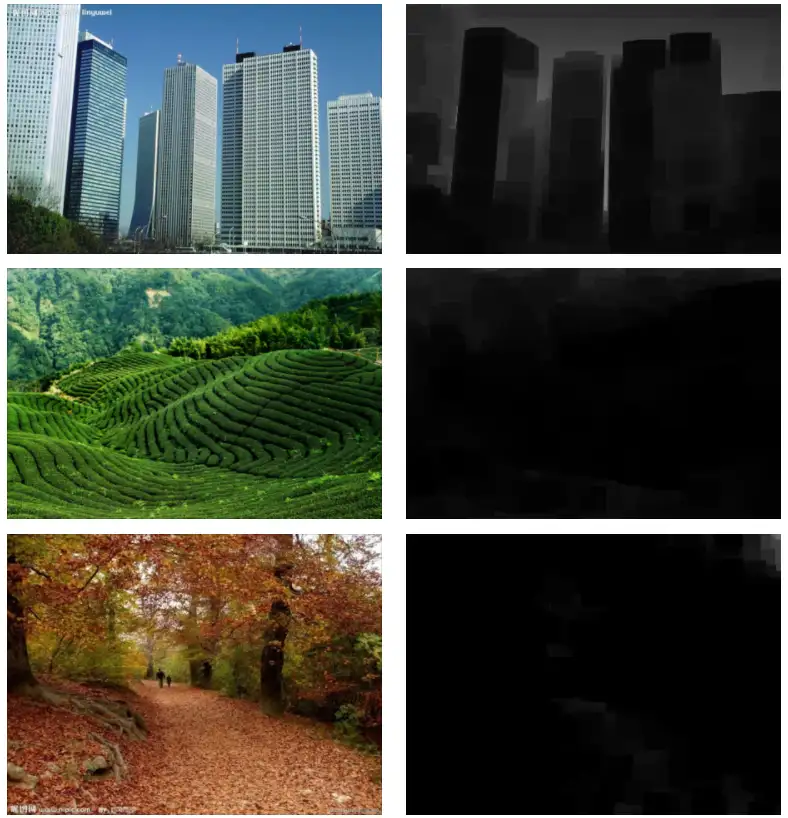 下面是一些常见场景的暗通道图像,可以看到非零像素的密度很小,称为稀疏图像。