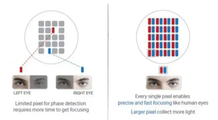 PD sensor 方案使用少量像素帮助对焦,工艺更加简单,但是由于信息较少,对焦所需的时间会更久。DP sensor 方案每个像素都提供对焦信息因此速度更快,但是工艺也更加复杂,成本通常更高一些。