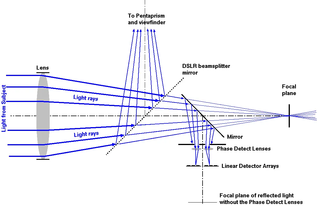 一些单反相机的AF功能采用了类似的原理,但实现方式略有不同。典型的光路如下图所示。
